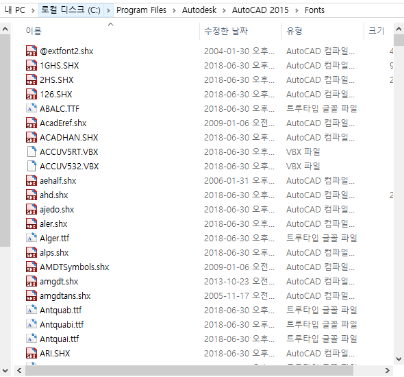 저는 지인으로부터 글꼴파일을 왕창 받았는데 shx , ttf 를 나눠서 따로 넣어주는게 귀찮아서 그냥 모두 복사했더니 뒤죽박죽 섞여있습니다만! SHX로 끝나는 파일만 저 경로에 넣어주시면 되겠습니다.